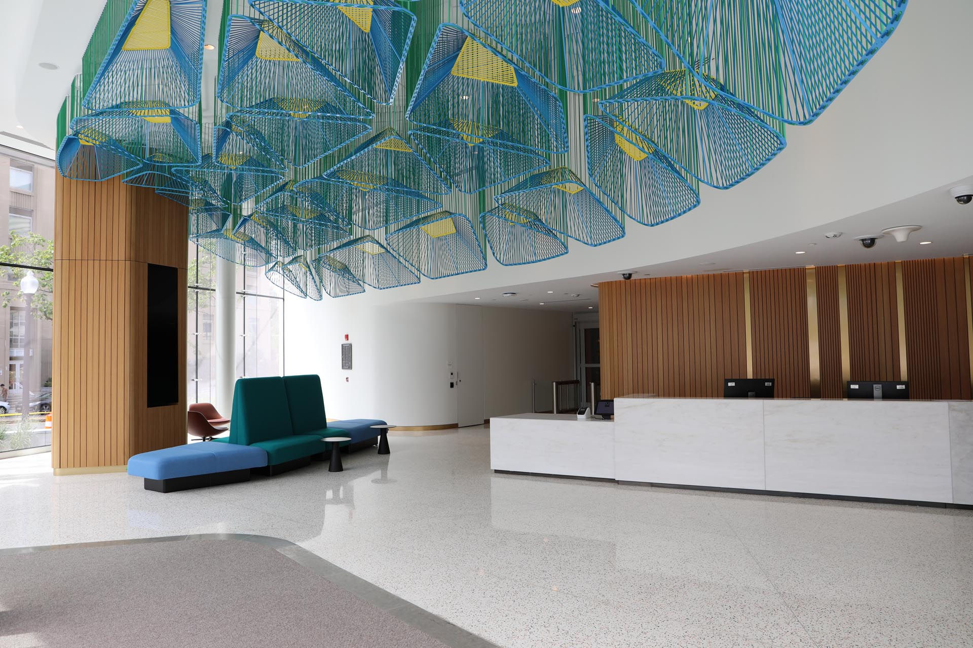 Aura is a suspended ceiling installation by Hou de Sousa featuring a dazzling array of color, light, and line. The sculpture is one of three in a triptych commissioned by WMATA as a part of their comprehensive headquarters renovation. All together the three artworks celebrate Washington's history of innovative urban planning and transit infrastructure, and pay tribute to architect Harry Weese's original iconic metro station design.