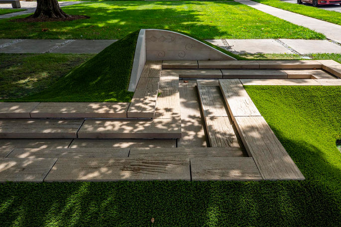 haptiK\BContemporary monument.Saarinen & Saarinen's First Christian ChurchColumbus, Indiana, USAExhibit Columbus 2021Steel, limestone, 3D printed metal, artificial turf.Variable DimensionsInstalled 2021